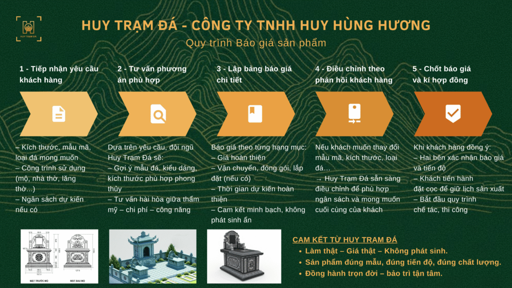 Huy Trạm Đá – thương hiệu thuộc Công ty TNHH Huy Hùng Hương, chuyên thiết kế và thi công lăng mộ đá, nhà thờ họ, cuốn thư, lan can đá bằng đá xanh rêu Thanh Hoá.