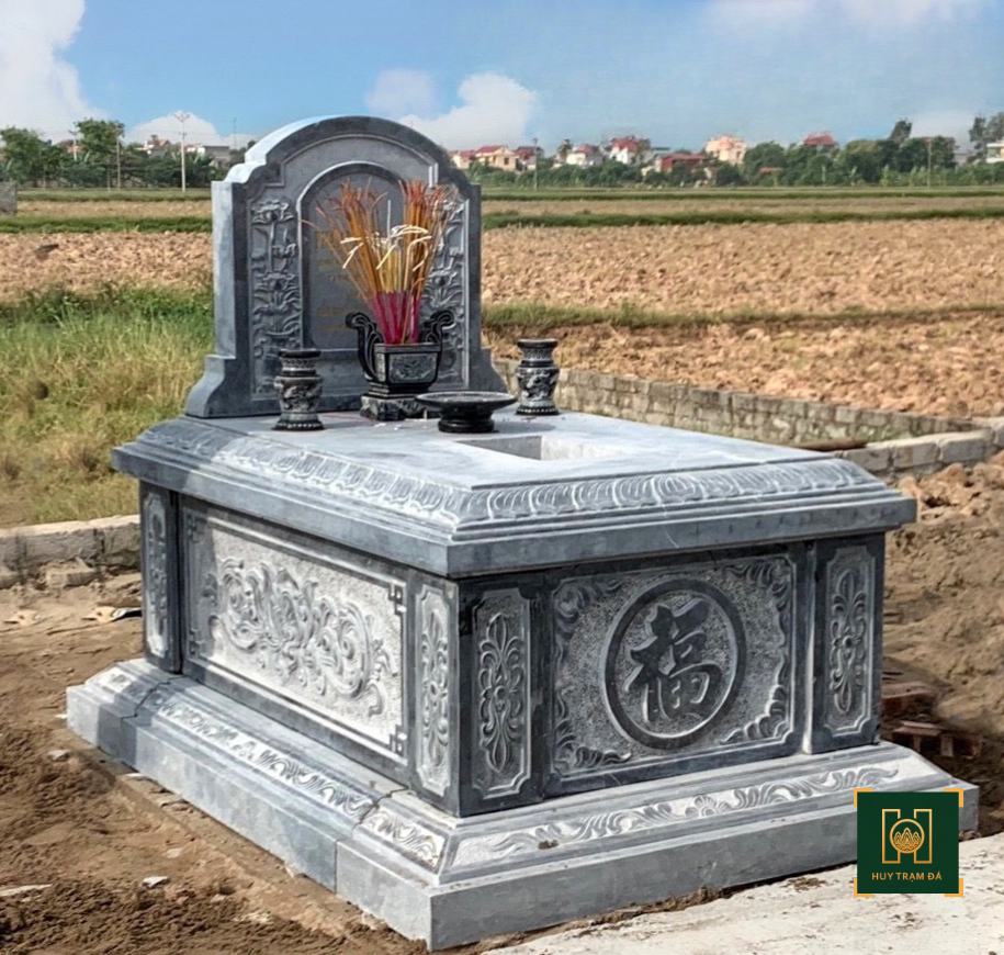 Sản phẩm được chế tác từ đá xanh đen nguyên khối Thanh Hóa, bề mặt mài phẳng hoặc mài mịn, giúp mộ luôn sạch sẽ – dễ lau chùi – bền đẹp trăm năm. Đây là lựa chọn lý tưởng cho các gia đình muốn một mẫu mộ uy nghi mà không rườm rà, sang trọng mà vẫn giữ nét truyền thống Việt.